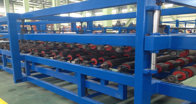 3.主機(jī)采用變頻調(diào)速,可按照預(yù)先設(shè)定的夾芯板長(zhǎng)度自動(dòng)切斷;